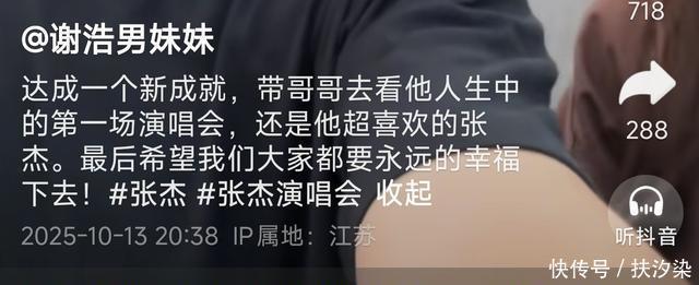 谢浩男说,他从13年前就喜欢张杰的歌,能现场看一次演唱会是他多年来的愿望没想到今天实现了! 谢浩男没想到,自己都27岁了,第一次看演唱会居然是妹妹请的。大妹说哥哥开心就好。