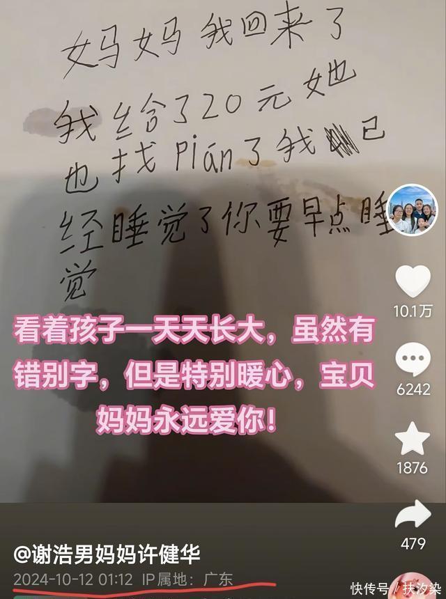 许健华陪娃乐开怀。 许健华的人生,自从丢了儿子谢浩男以后就是灰暗的,她自责、痛苦、抑郁、无助,有时候怀里抱个娃、手里领个娃,还要到处奔波去找那个丢了的娃。 后来,儿子没找到,家又被偷了,丈夫成了前夫,两个大女儿不在身边,只有小女儿陪着她,在那些看不到希望的岁月里,小女儿就是她生命里的一抹亮光。 但是许健华还要去送快递,有时候半夜十二点才送完,她只能提前给小女儿留点钱,让小妹放了学自己去买一点吃的,然后自己写作业,自己睡觉。 小妹很懂事,妈妈留给她的20块钱,她除了买饭,从来不乱花钱,又把剩余的钱给妈妈,还给妈妈留了纸条。